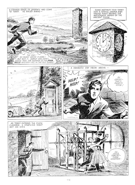 The next story is interesting from multiple points of view. There's a clandestine group of do-gooder girls operating at this private girls' school. These middle class agents of freedom assist a working class girl in achieving justice. In a world away from the oversight of the patriarchs, females can express their full potential, even be heroines. I have no idea whether or not the Silent Three was an ongoing series in the weekly comic, but it seems it would have made a good one: